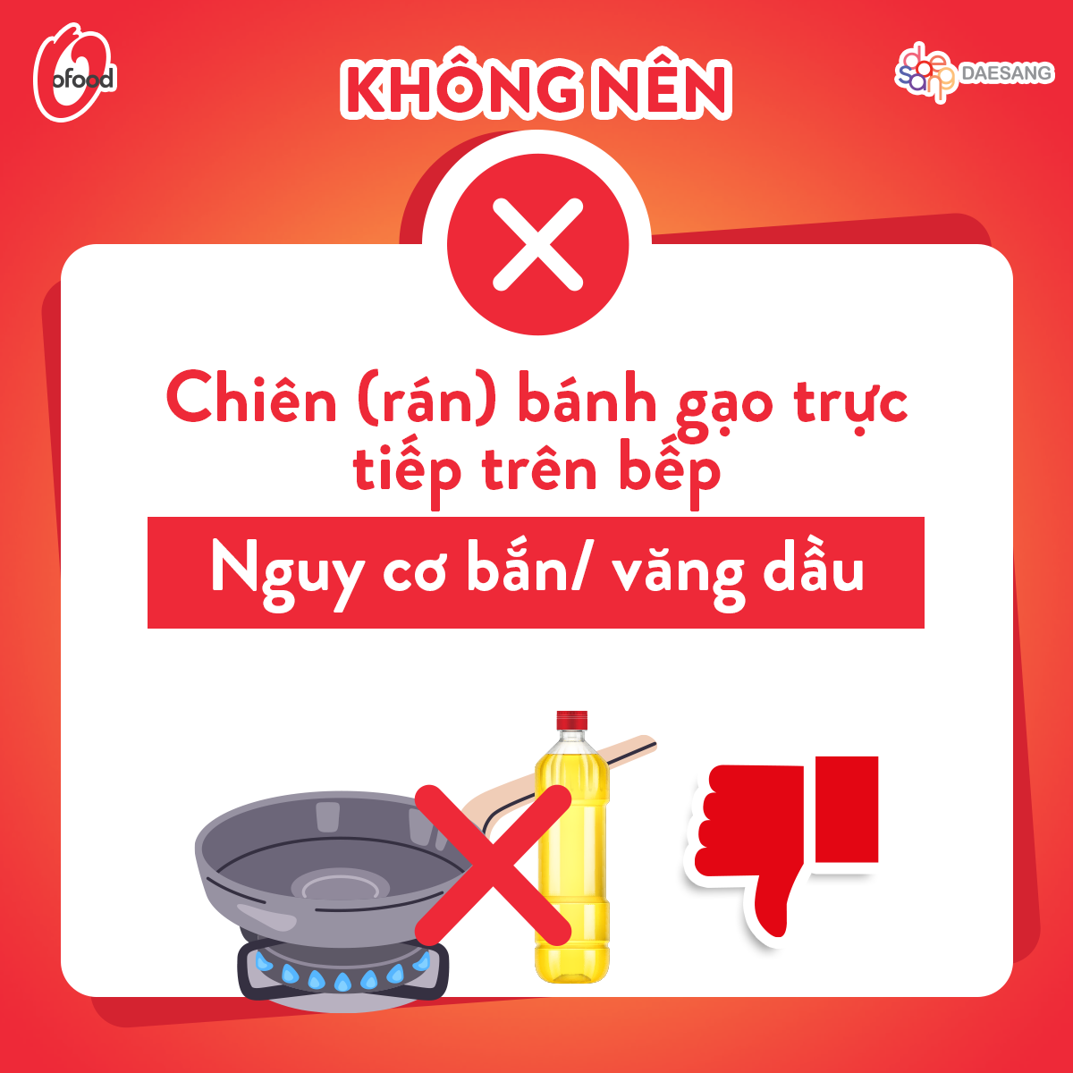 Không chiên trực tiếp bánh gạo trong dầu ăn: dễ gây bắn và văng dầu. Nếu bạn muốn chiên bánh gạo, hãy quết chút dầu lên mặt bánh và chiên trong nồi chiên không dầu