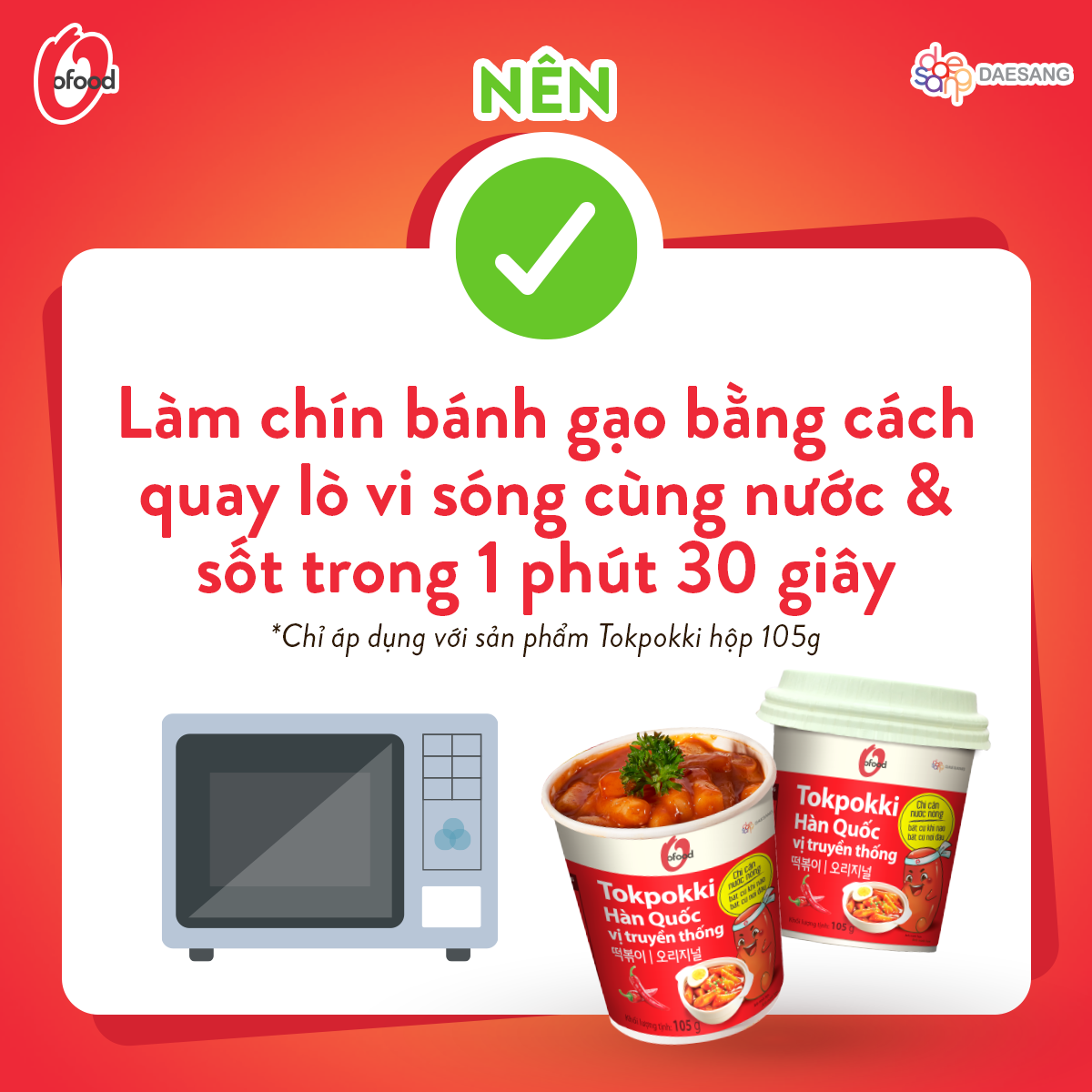 Quay lò vi sóng (áp dụng cho hộp Tokpokki 105g): chỉ mất 1 phút 30 giây, bạn có ngay phần ăn nóng hổi, nhanh chóng và tiện lợi.