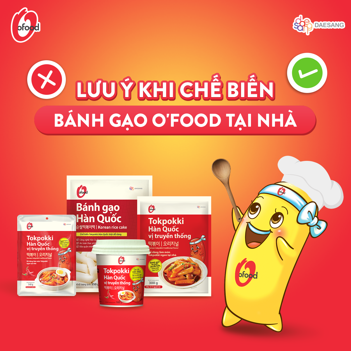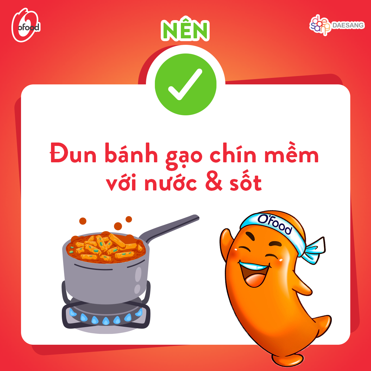 Nấu cùng nước lọc & sốt Tokpokki O’food: chỉ cần đun nhỏ lửa với gói sốt đi kèm hoặc sốt tự pha chế, bánh gạo sẽ mềm dẻo và ngấm vị.