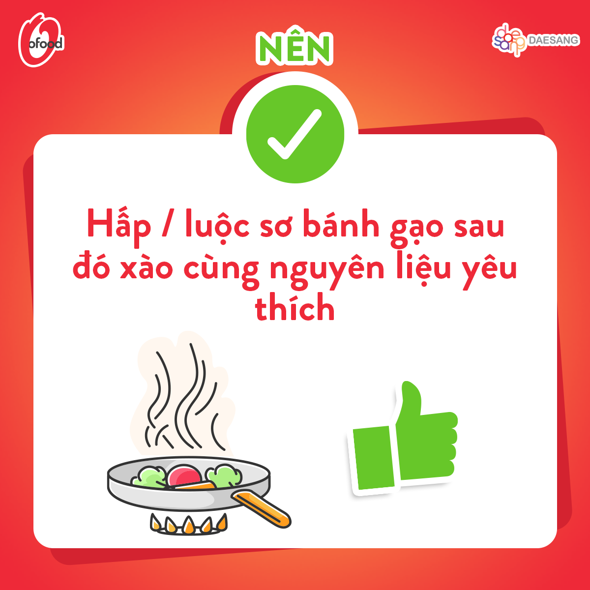 Hấp/luộc rồi xào với nguyên liệu yêu thích: sau khi hấp/luộc chín, bạn có thể xào bánh gạo với thịt bò, kim chi, rau củ hoặc hải sản để đổi vị.
