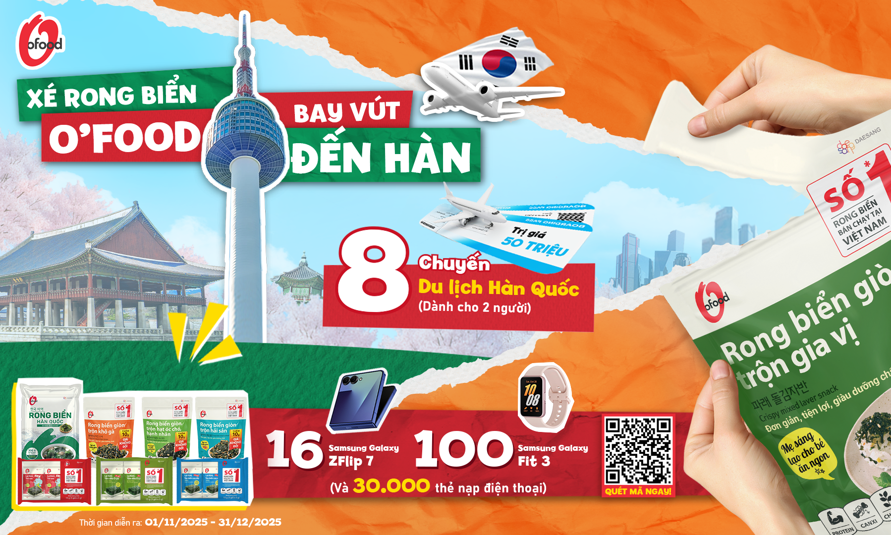 Tham gia ngay chương trình “XÉ RONG BIỂN O'FOOD – BAY VÚT ĐẾN HÀN” để có cơ hội du lịch Hàn Quốc miễn phí, rinh ngay siêu phẩm Samsung Z Flip 7, cùng hàng chục ngàn quà tặng cực chất đang chờ đón bạn!